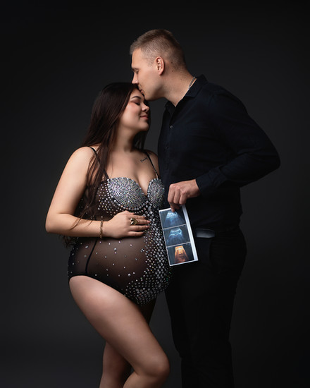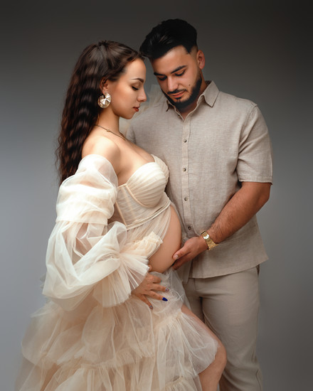 D’autres femmes souhaitent partager ce moment avec leur partenaire. Une séance grossesse en couple, dans mon studio, ce n’est jamais une mise en scène forcée. C’est une présence, un regard, une main posée sur le ventre. Parfois il y a des rires, parfois du silence. On laisse les gestes venir naturellement. Ces images deviennent souvent, avec les années, des souvenirs précieux pour toute la famille.