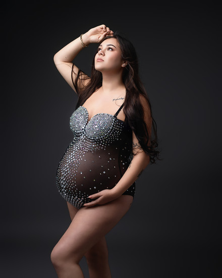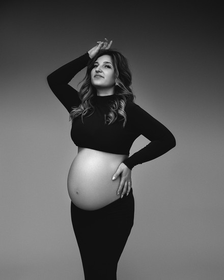 Enfin, il y a les séances plus mode. Des séances grossesse inspirées de la photographie éditoriale, avec des tenues fortes, une énergie affirmée, des poses plus marquées. La grossesse devient alors une image puissante, presque une déclaration.